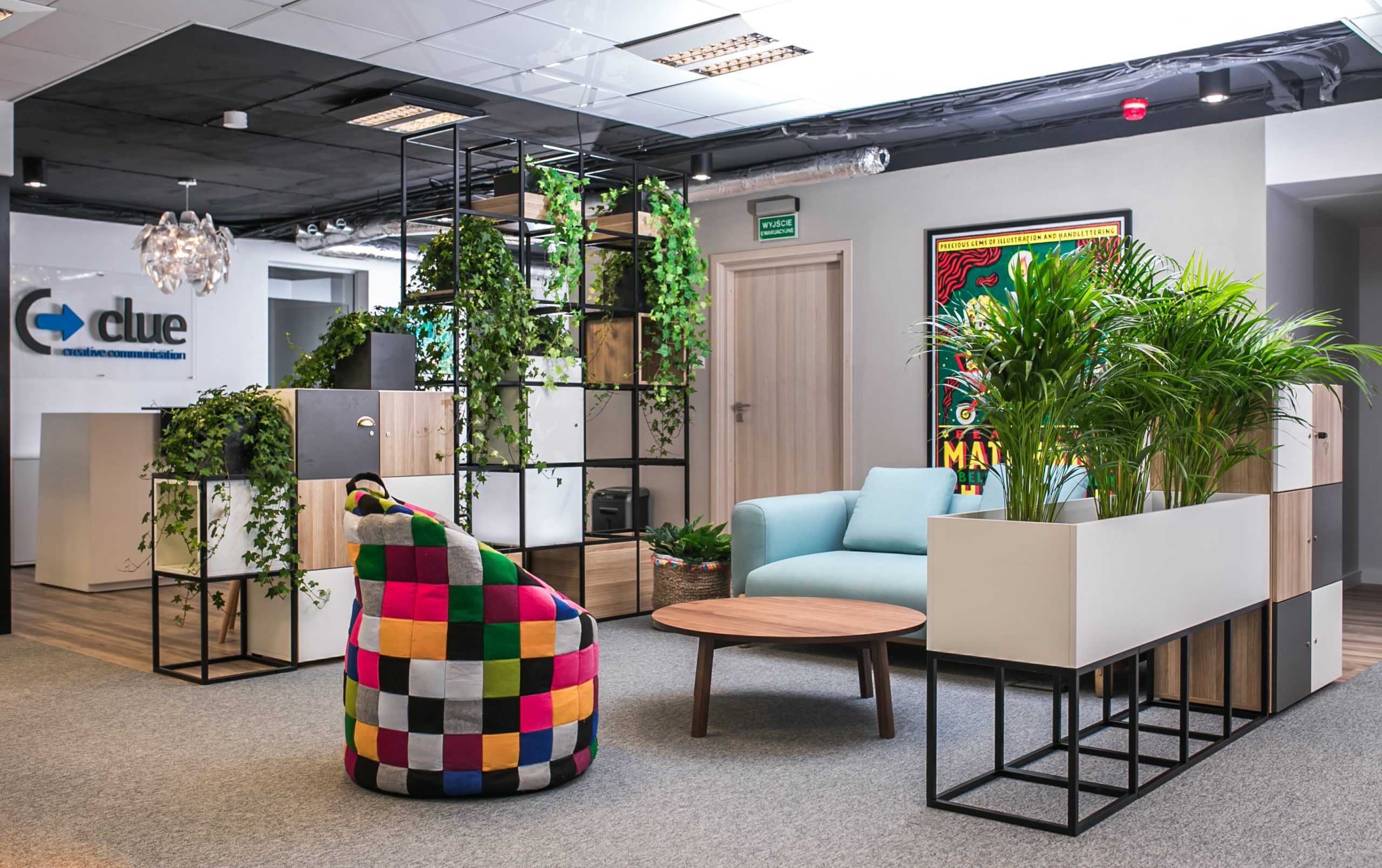 Firma Clue PR , zmieniając lokalizacje i siedzibę swojej firmy powierzyła nam zaprojektowanie i wyposażenie nowego biura. Otwarte podejście Właścicieli oraz chęć stworzenia kreatywnego wnętrza pozwoliło nam wykreować funkcjonalną, ale pełną koloru i roślin przestrzeń biurową.
