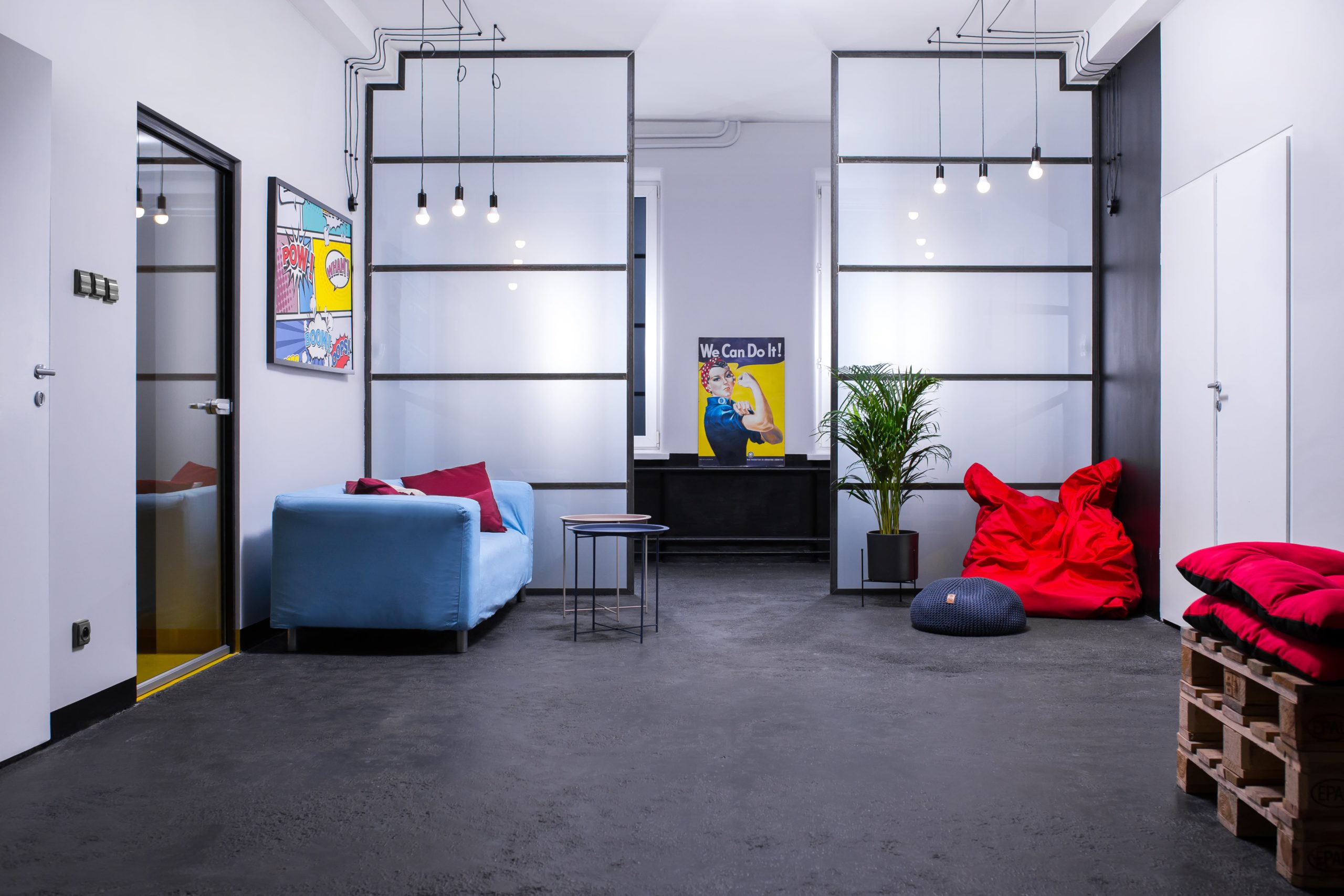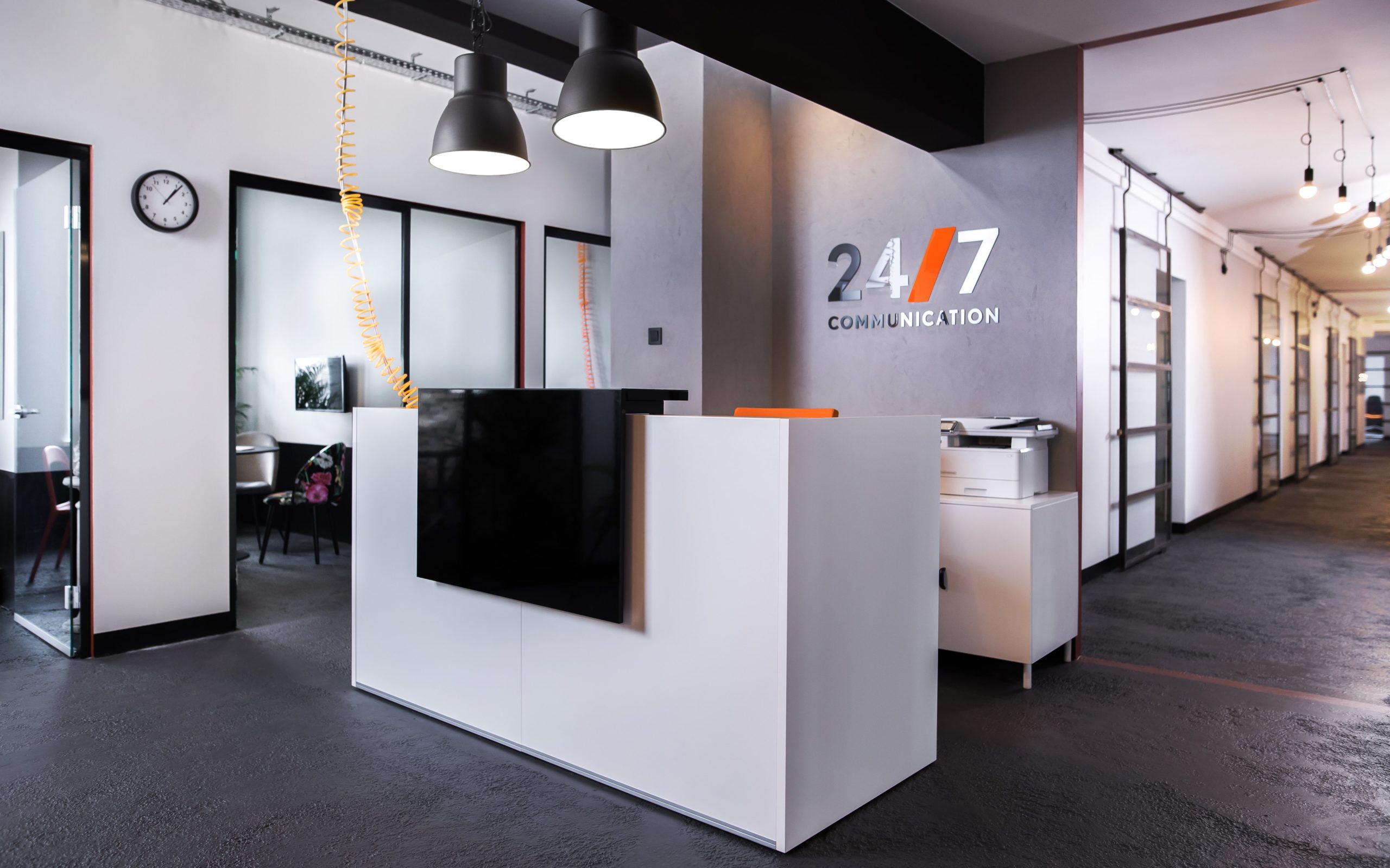 Kompleksowy projekt wnętrza obecnej siedziby firmy, z nadzorem nad realizacją prac remontowych dla naszego Klienta z branży PR – 24/7 Communication.