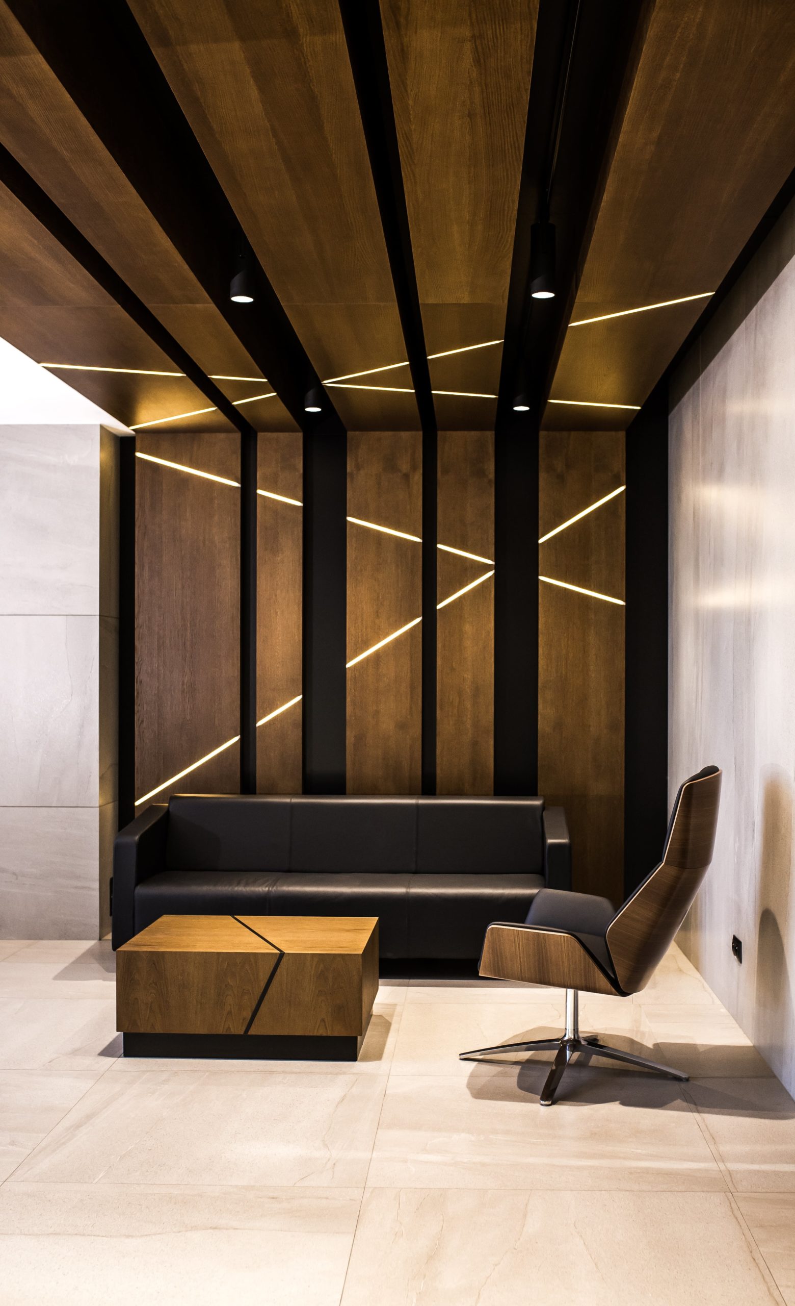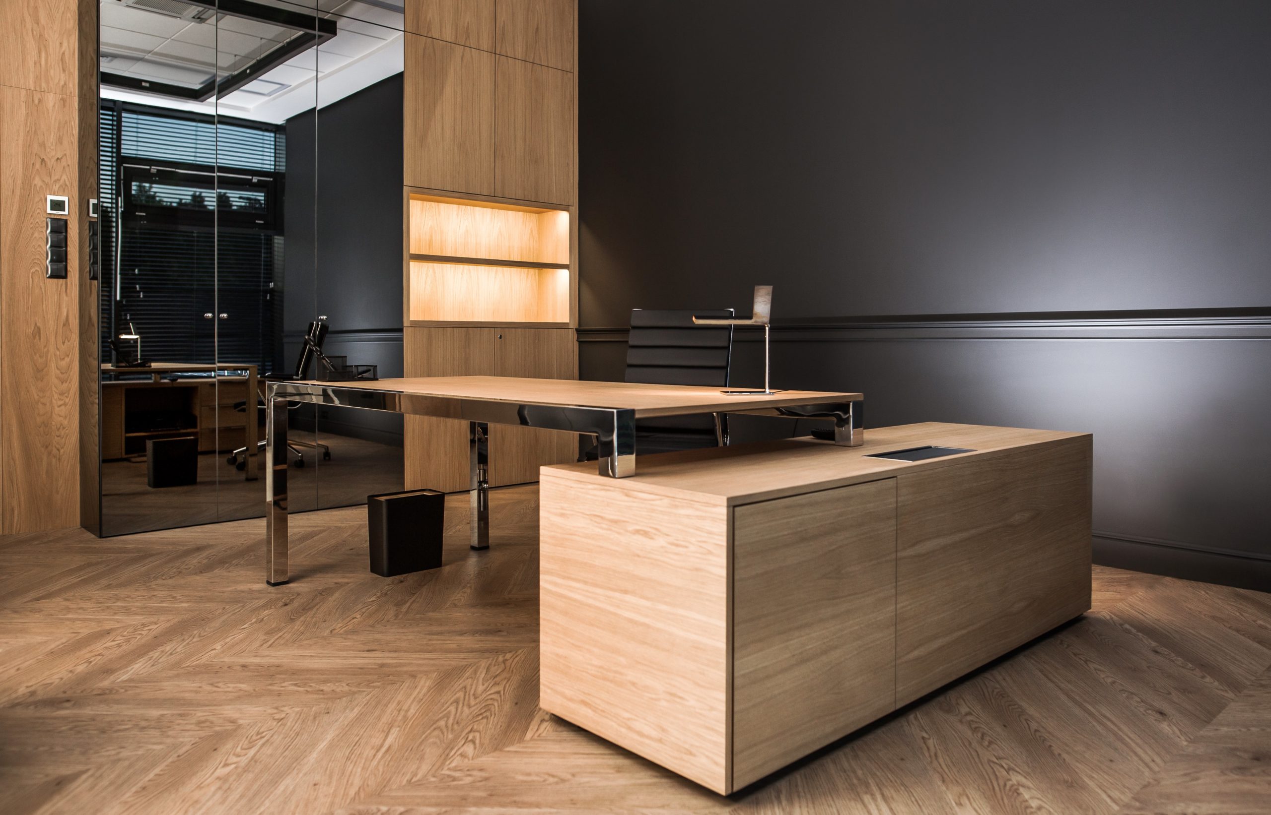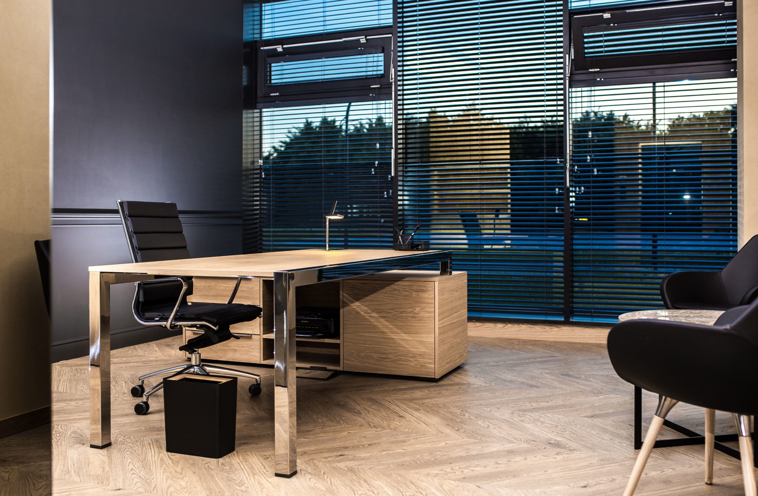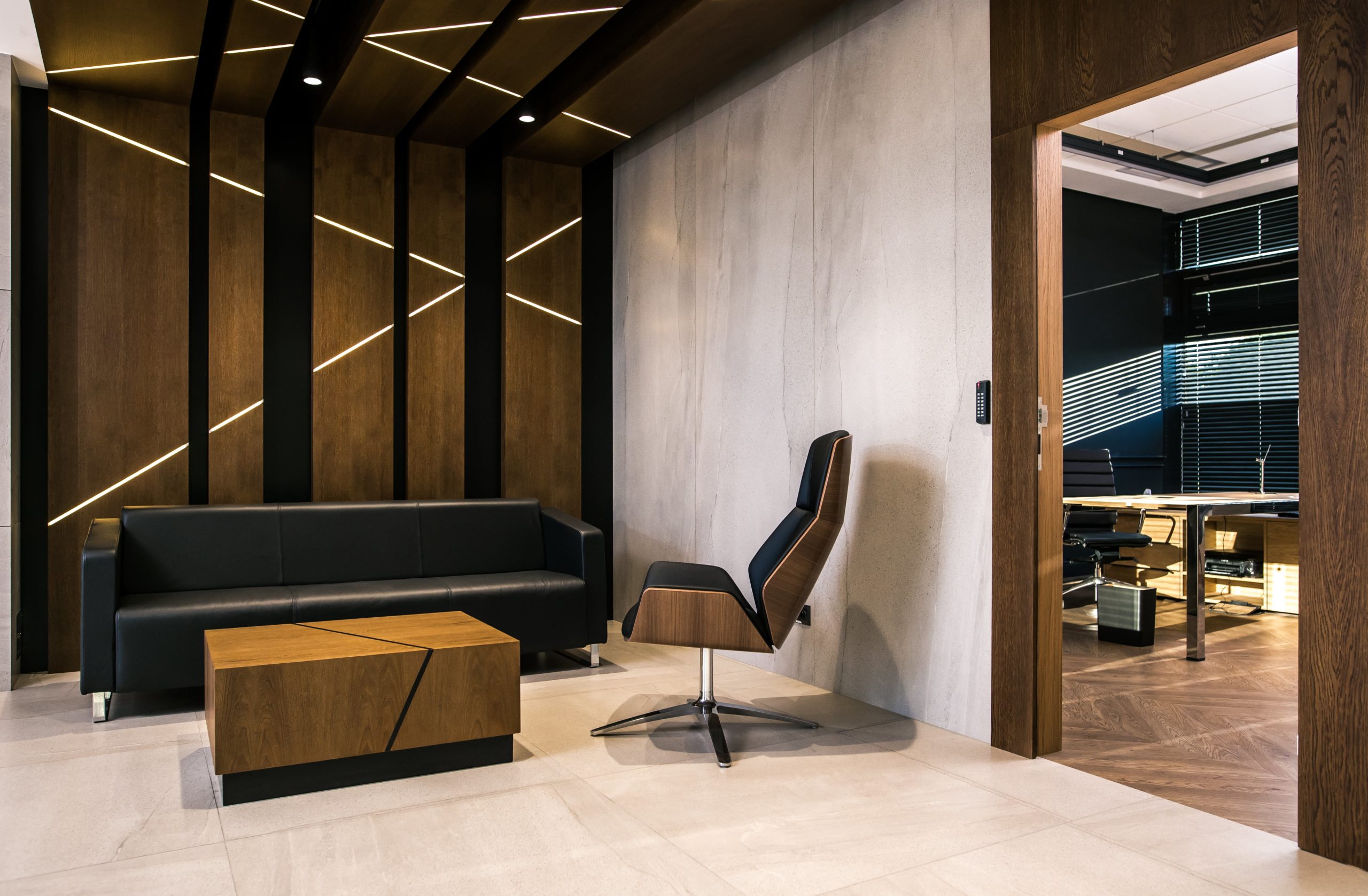 Przy ścisłej współpracy z bardzo wymagającym Klientem stworzyliśmy klimatyczne i indywidualne przestrzenie do pracy, tworzące elegancki i wyszukany charakter biura. Wszystkie elementy meblowe jak i zabudowy (ściany, drzwi, sufity) zostały wykonane z najwyższej jakości materiałów, takich jak okleiny naturalne, lakiery w wysokim połysku czy elementy stelaży wykonane ręczne ze stali polerowanej. Nowy budynek biurowy i jego wnętrza odzwierciedlają klasę i dobry gust właścicieli, a także precyzję wykonania nieszablonowych produktów.